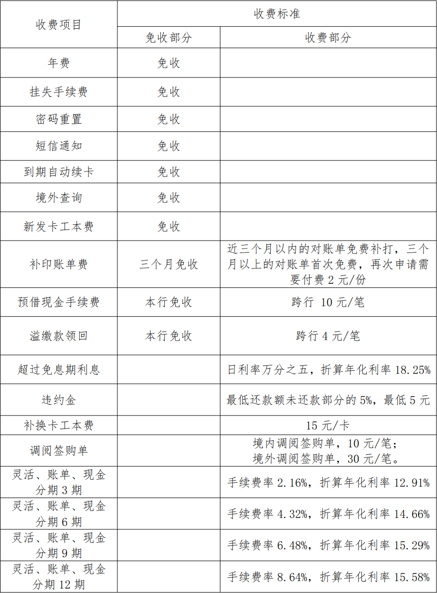 第十三条 分期手续费:账单分期、灵活分期和现金分期,3期手续费率2.16%,折算年化利率12.91%;6期手续费率4.32%,折算年化利率14.66%;9期手续费率6.48%,折算年化利率15.29%;12期手续费率8.64%,折算年化利率15.58%。折算年化利率值仅供参考,实际年化利率可能因交易时间、还款时间等不同与参考值存在差异,未依约还款不适用上述年化利率。