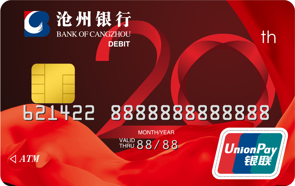 行庆卡:是我行成立20周年之际发行的纪念卡产品,卡面设计以沧州银行成立20周年为主题,整体色调以代表吉祥与收获的中国红为主,鲜红的丝绸既凸显了20周年庆的主题形象,也寓意我行与广大客户共建“丝绸之路”、共享成就与喜悦。