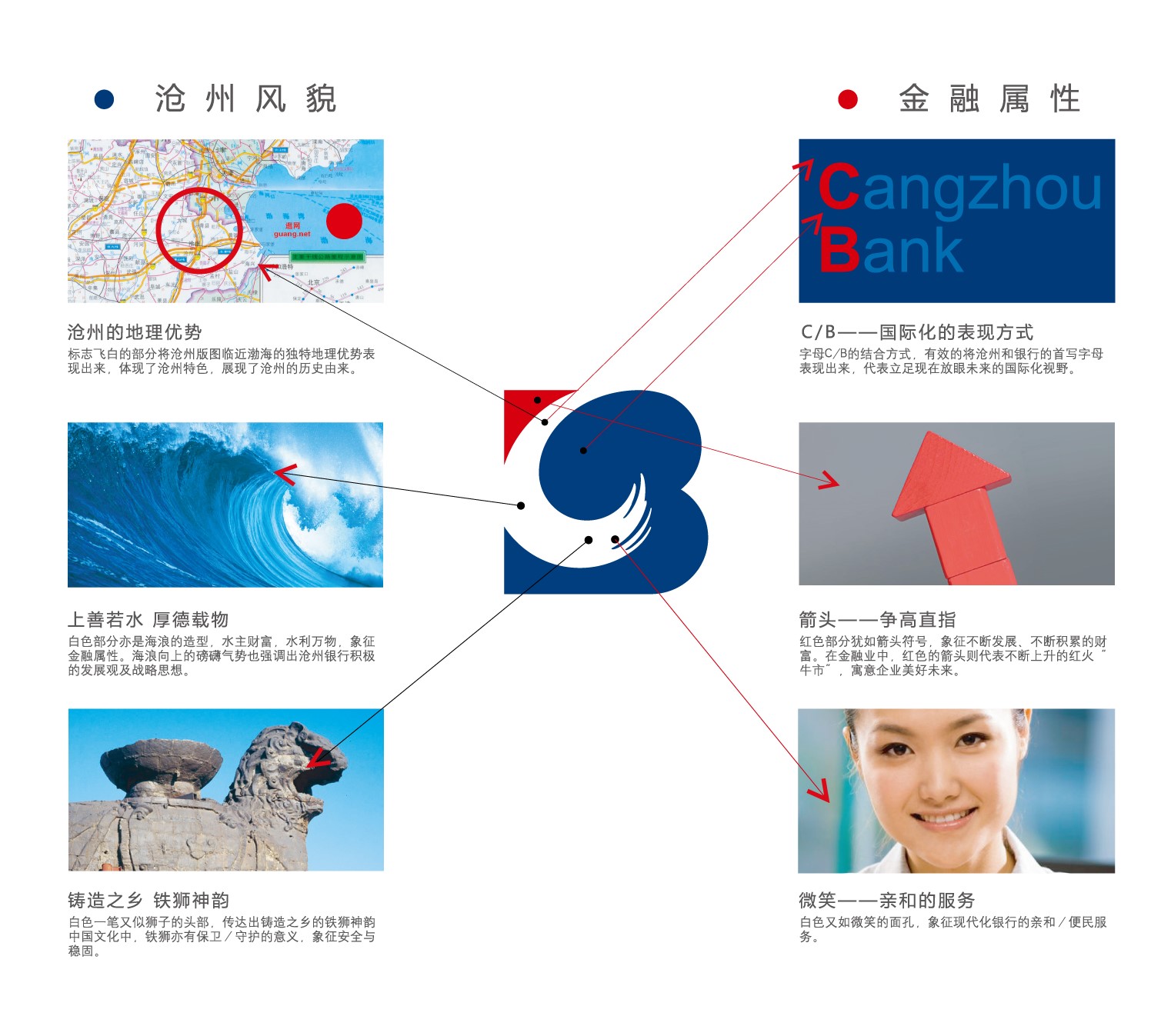 标志飞白部分将沧州临海的独特地理优势表现出来,体现了沧州特色。白色部分运用海浪造型,体现了水主财富,水利万物,象征金融属性,海浪向上的磅礴气势也强调出沧州银行积极的发展观及战略思想。白色一笔又似狮子的头部,传递出铸造之乡铁狮神韵的传统中国文化。同时,铁狮亦有保卫、守护的含义,象征金融行业的安全与稳固。字母C/B的结合方式,有效地将沧州和银行的首字母表现出来,展示沧州银行立足现在、放眼未来的国际化视野。红色部分犹如箭头符号,象征不断发展,不断积累的财富;在金融业中,红色的箭头则代表不断上升的红火牛市,寓意企业经营蒸蒸日上的美好未来。