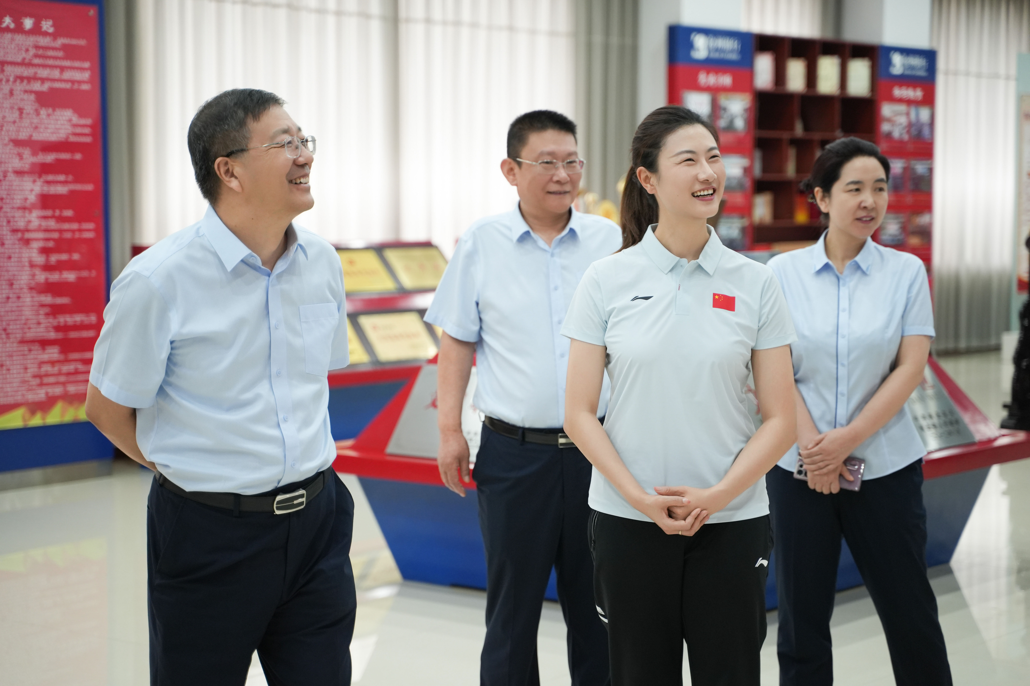 捐赠仪式结束后,丁宁先后参观了沧州银行迎宾支行、党建文化室和职工活动室,与梁宝龙董事长共同在“冠军卡”主题背景板上签名留念,一一满足了现场客户和“宁粉”们合影签名的愿望,并饶有兴致地同员工球迷交流切磋球技。她对沧州银行在推动改革转型、服务地方发展、履行社会责任等方面取得的成果,以及积极倡导“健康生活、快乐工作”的理念大力点赞。