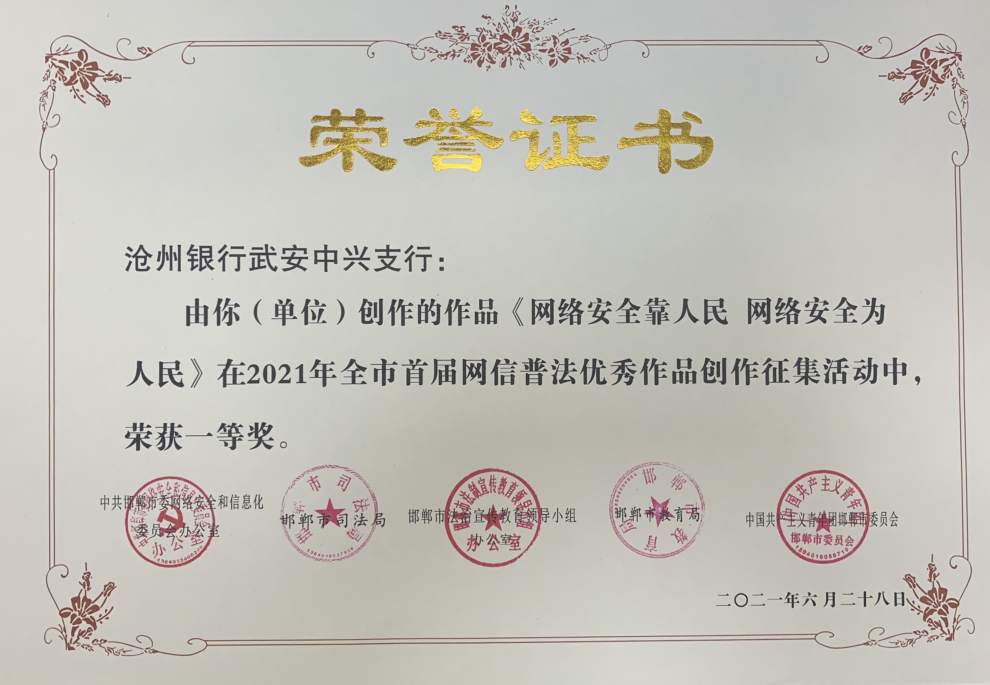 各支行高度重视,认真准备,牺牲业余时间精心录制视频,制作美篇,邯郸分行共上报了7部作品,经过激烈角逐,武安中兴支行《网络安全靠人民 网络安全为人民》荣获一等奖,分行营业部马晓航《网络安全法》荣获二等奖,磁县支行《网络安全小课堂》荣获三等奖,邯郸分行荣获“优秀组织单位”,展现了沧州银行员工风采和宣传成果,得到了举办方的肯定和认可。